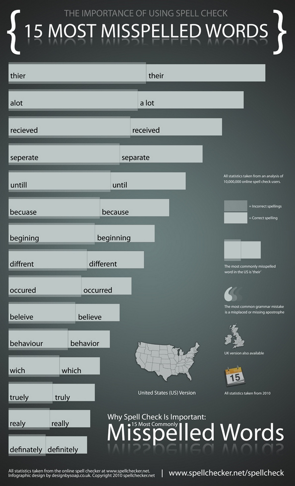 Так или иначе, но в данной инфографике вы увидите 15 самых проблемных с точки зрения написания английских слов (most misspelled words). Данные сформированы на основе анализа 10 миллионов проверок орфографии в Интернете.